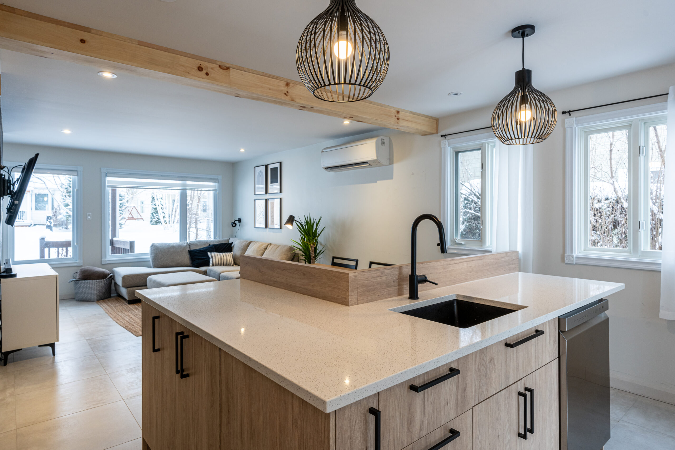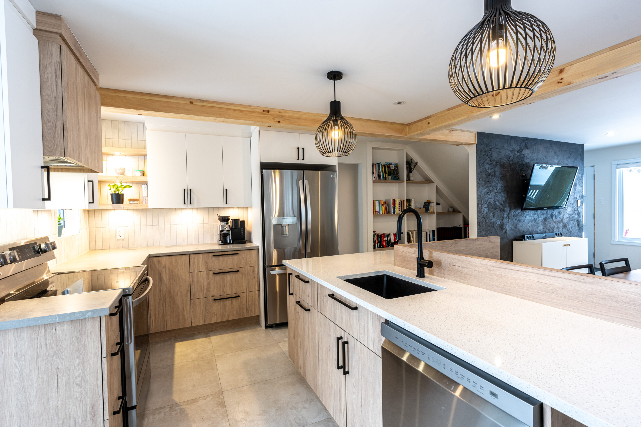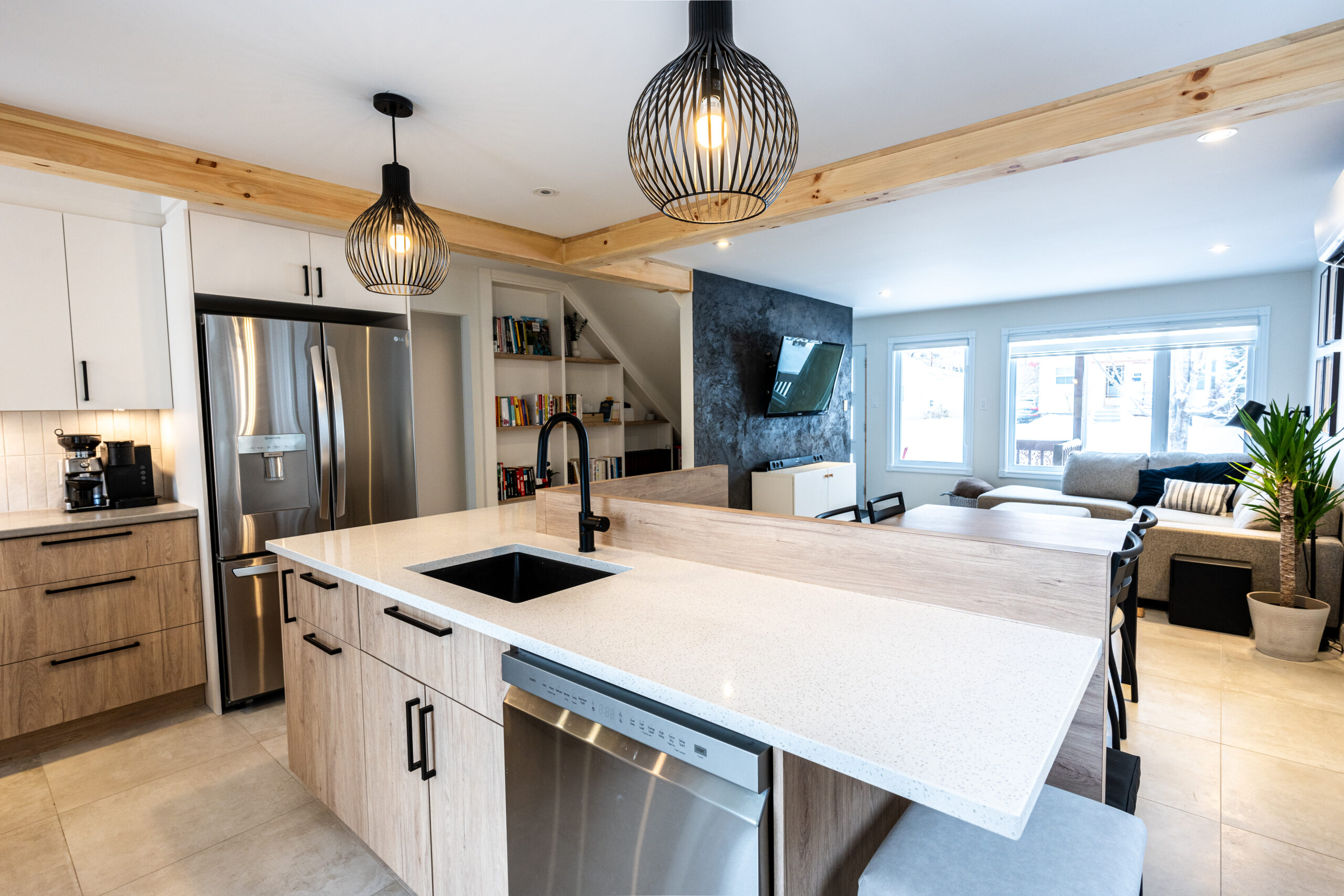Cuisine de rêve avec agencement de bois et de mélamine noire et vue incroyable sur la rivière