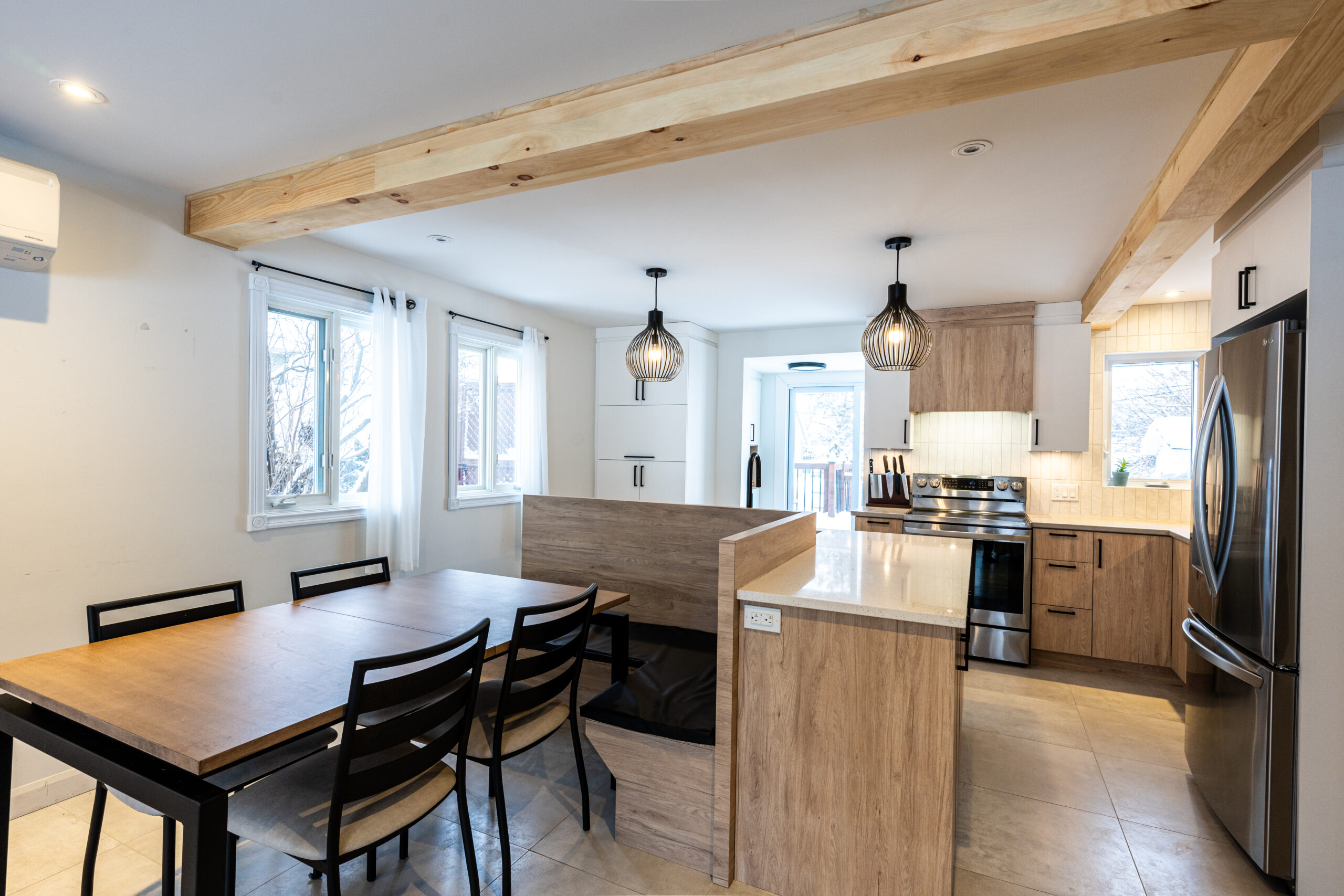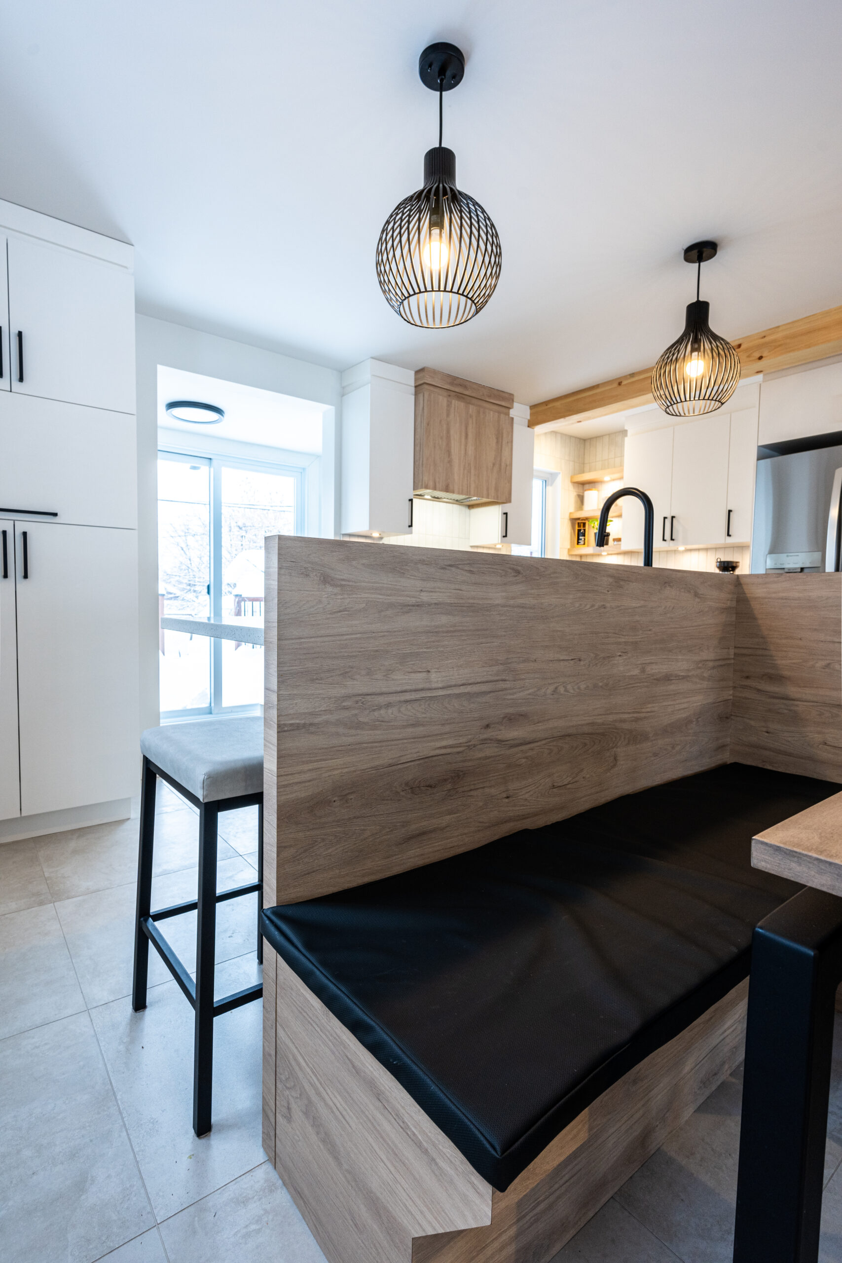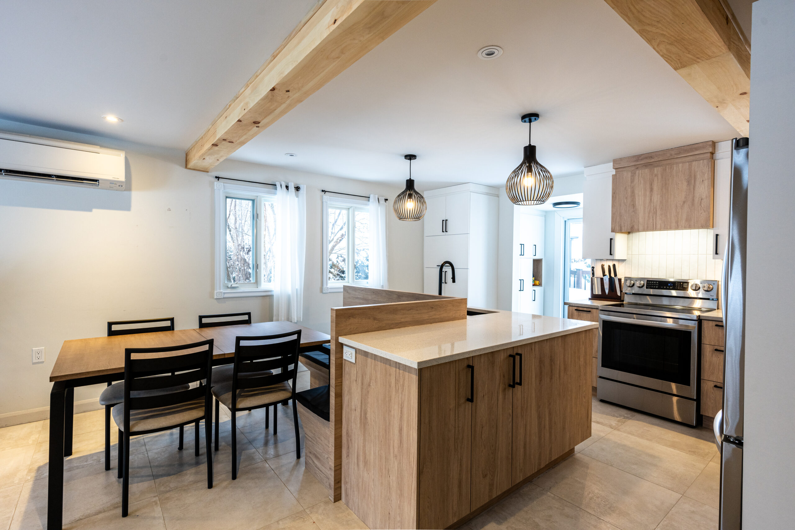 Cuisine de rêve avec agencement de bois et de mélamine noire et vue incroyable sur la rivière